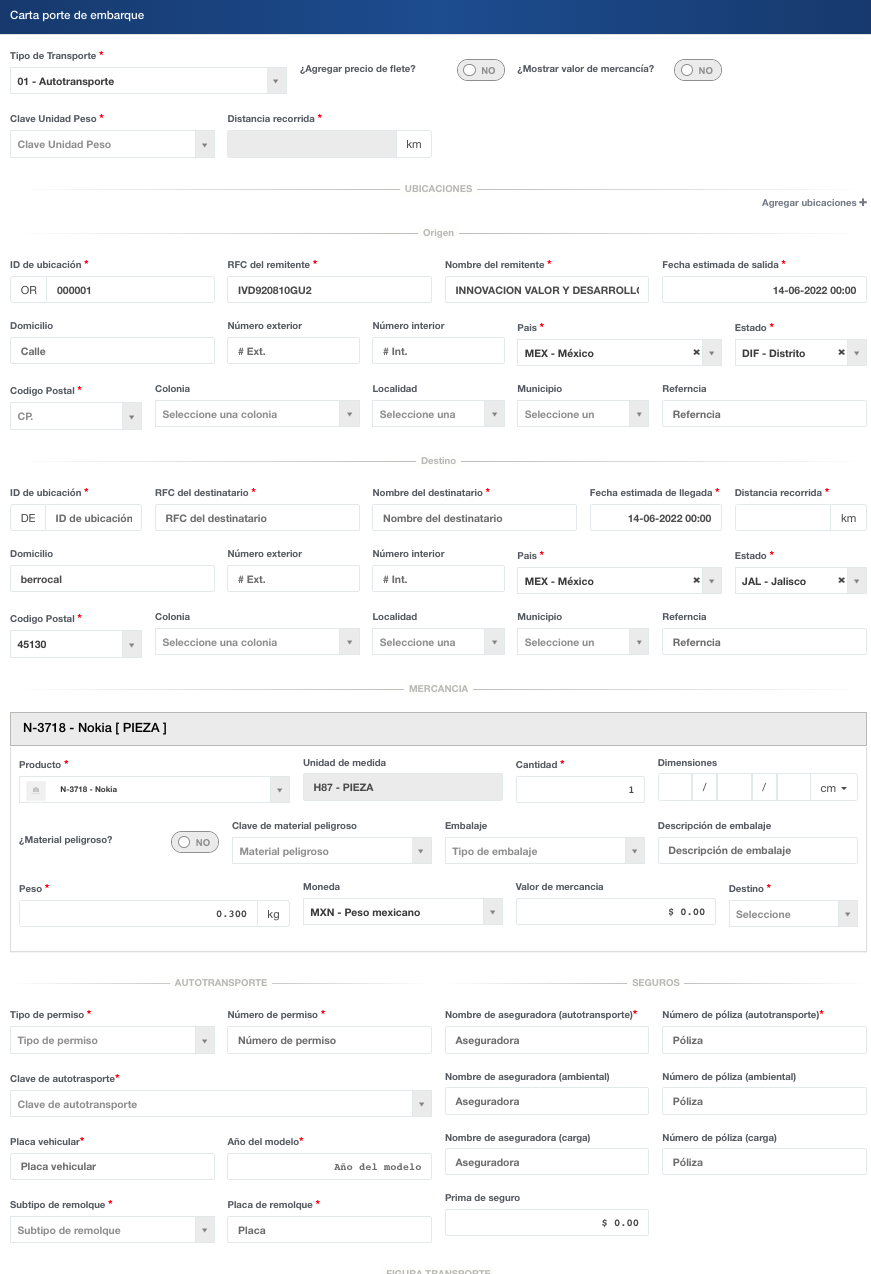 Una vez agregados los datos relacionados se debe de usar el botón de guardar, esto generará su carta porte.
