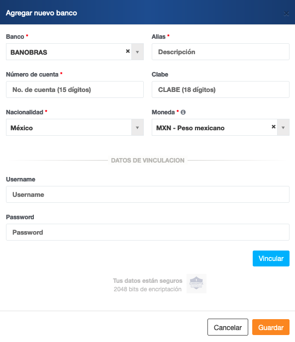 Se deben de agregar los datos del banco el cual se está generando la cuenta bancaria.
