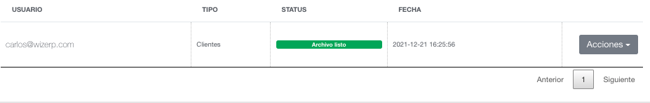 3.- Se generará un registro nuevo en la lista con el usuario que hizo la petición y la fecha, hay que esperar que termine la descarga y se muestre el botón acciones.