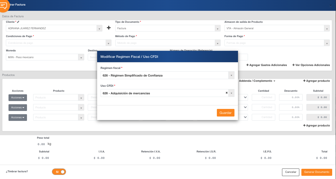 Cuando se esté realizando el documento de venta se podrá actualizar la información Uso de CFDI y Régimen Fiscal desde el lápiz que se encuentra a un costado del texto cliente.