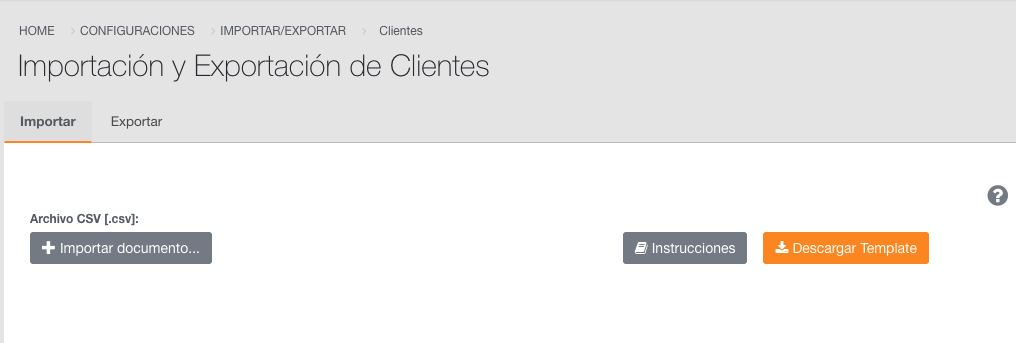 6. Una vez que se cuente con toda la información actualizada, hay que ir a engranes / importar / Exportar / clientes y en la pestaña Importar hay que descargar la plantilla para poder cargar la información.