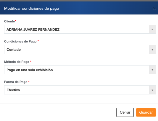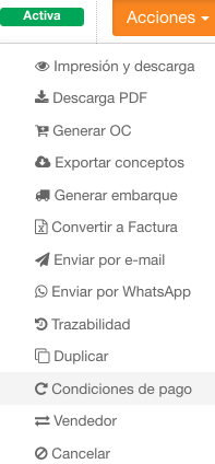 Una vez hecho el documento, en el botón acciones podrás actualizar en la Remisión (Previo a facturar) en la opción Condiciones de pago: