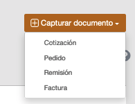 Para iniciar se debe de abrir el modal para generar su documento de cotización, pedido, remisión o factura esto desde el botón de + o usando el botón de Capturar documento. Seleccionar factura