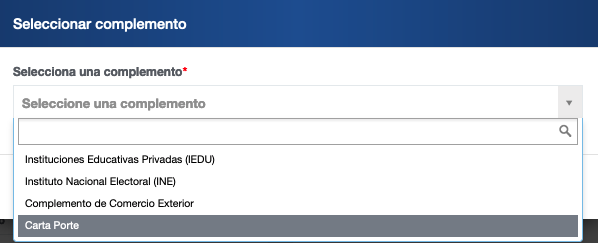 Se mostrará la la ventana de selección de complemento donde seleccionaremos Carta porte lo que nos mostrará