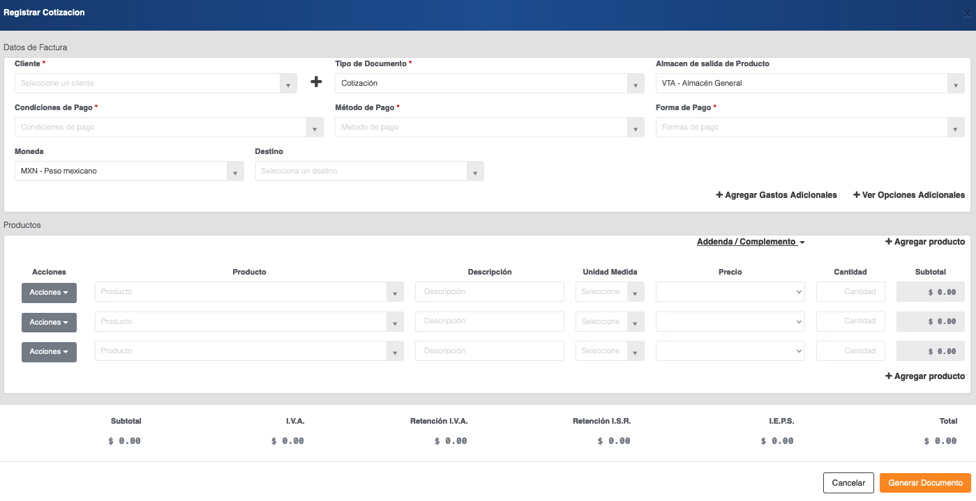 Ya guardados se mostrará la ventana de factura en el cual deberemos de usar el botón de generar documento para timbrar el mismo.