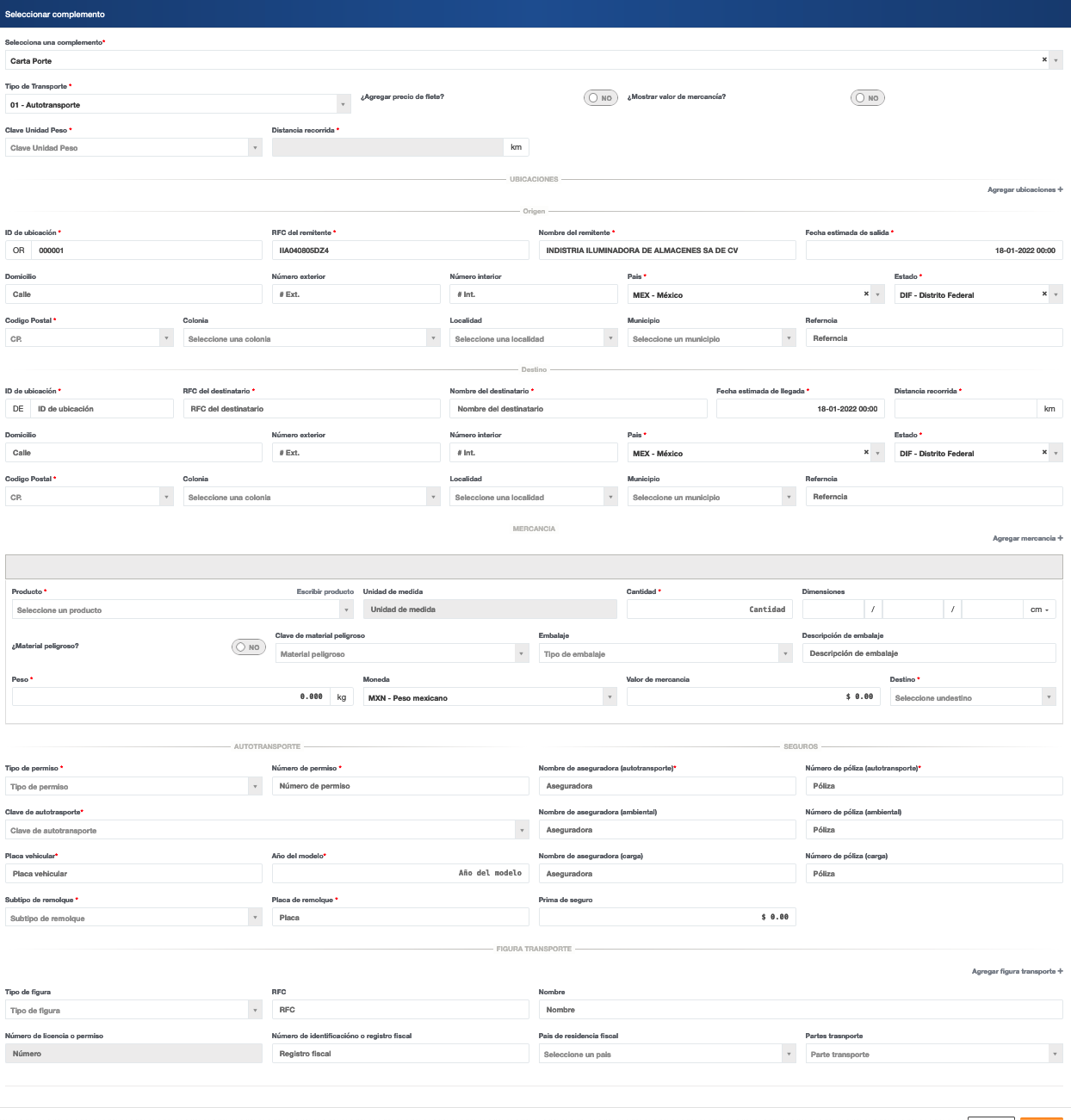 Al elegir este complemento se mostrarán los campos en los cuales se deben de capturar los datos del emisor receptor y la mercancía que se va a trasladar.