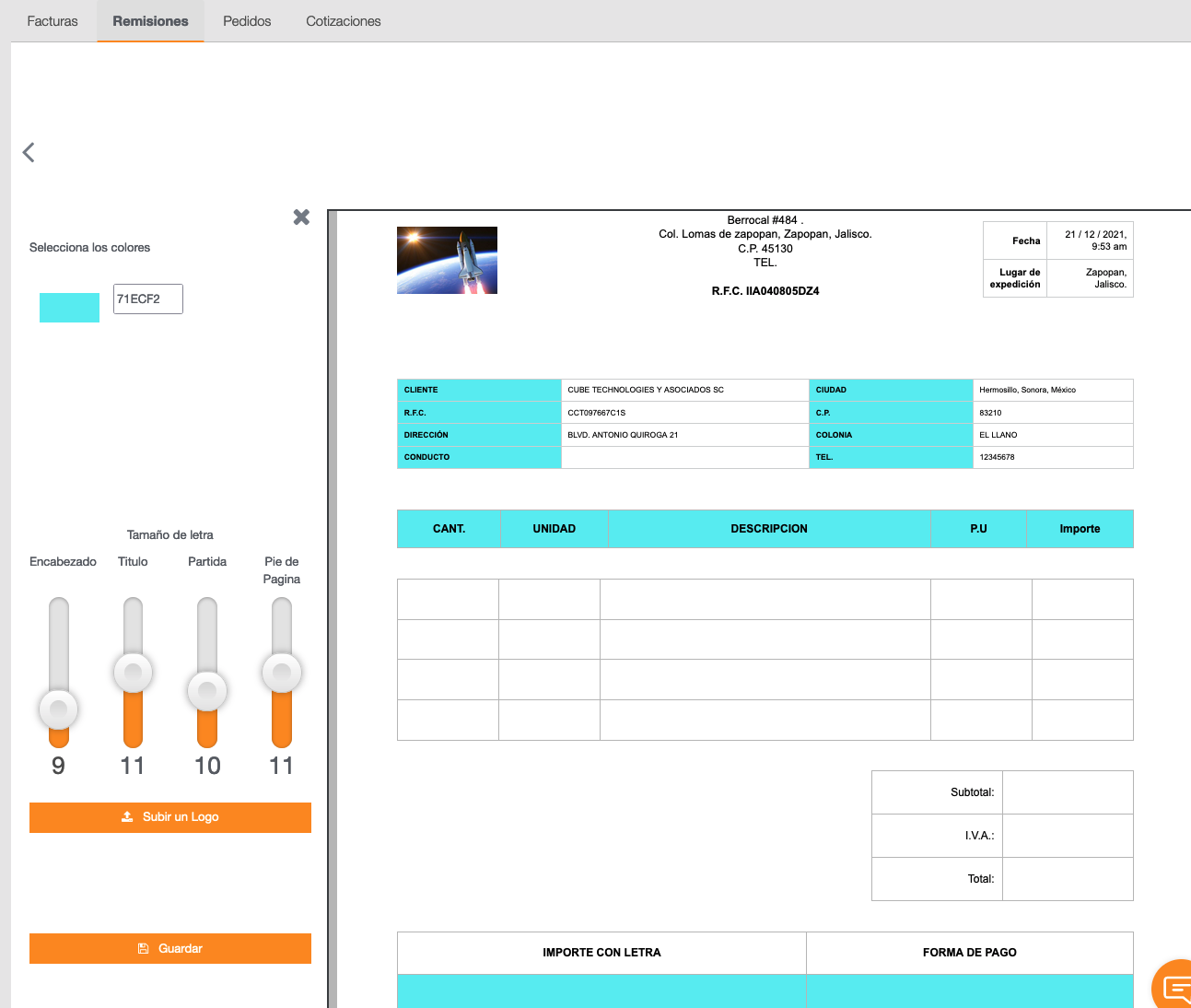 Desde la pestaña de remisiones podemos encontrar la plantilla a la cual podemos editar colores y tamaño de la letra.