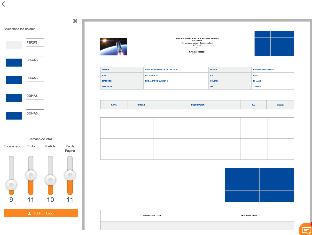 Desde la pestaña de Facturas podrá elegir el diseño que mas se adecue a sus necesidades y cambiar el color y el tamaño de letra para personalizar su documento.