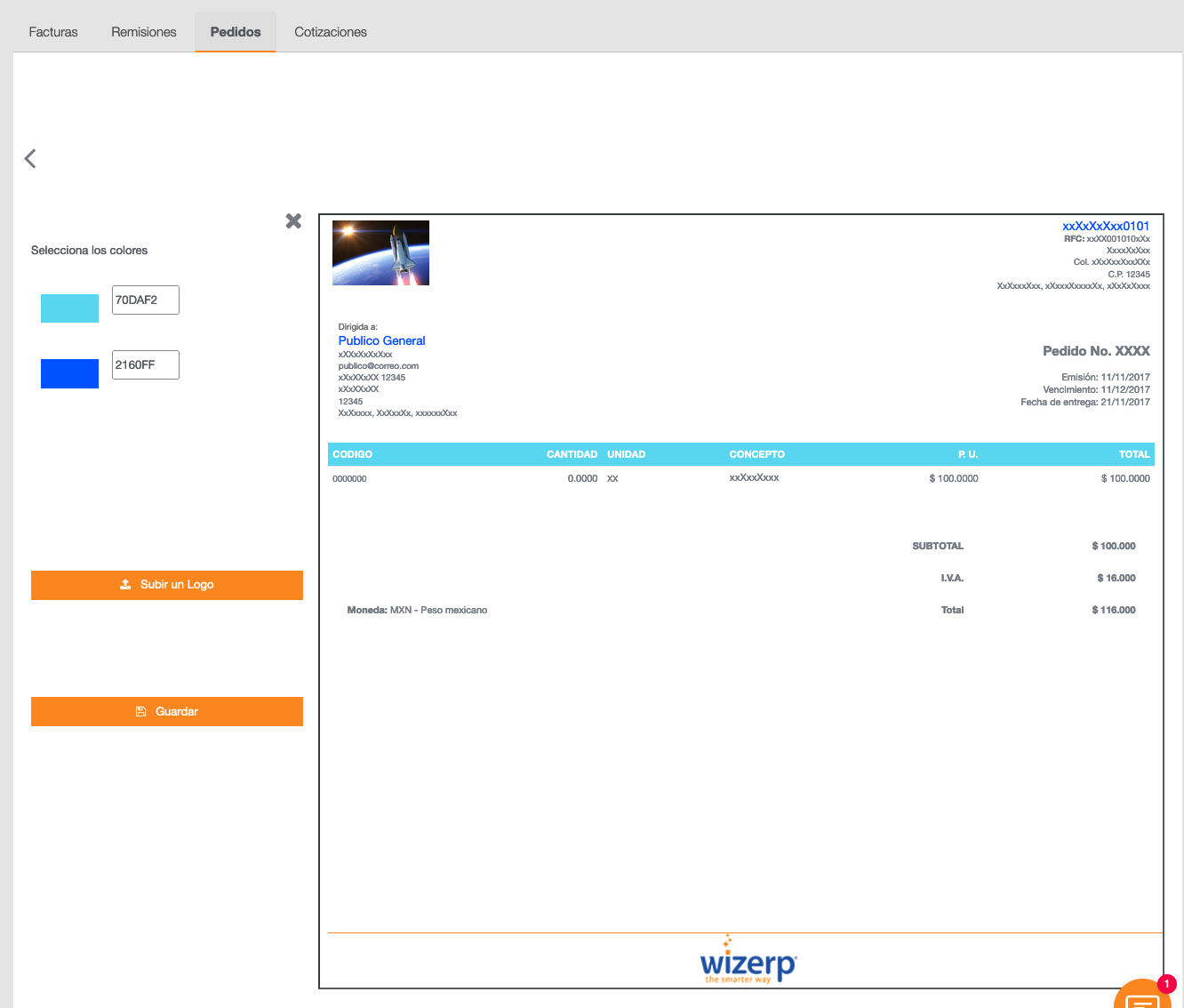 Desde la pestaña de Pedido podemos encontrar la plantilla a la cual podemos editar colores y tamaño de la letra.