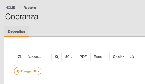Se puede filtrar por Cliente, moneda pago, tipo de depósito, Venta, Fecha del depósito, fecha del pago. Puede exportar en PDF o bien Excel.