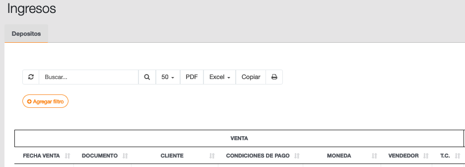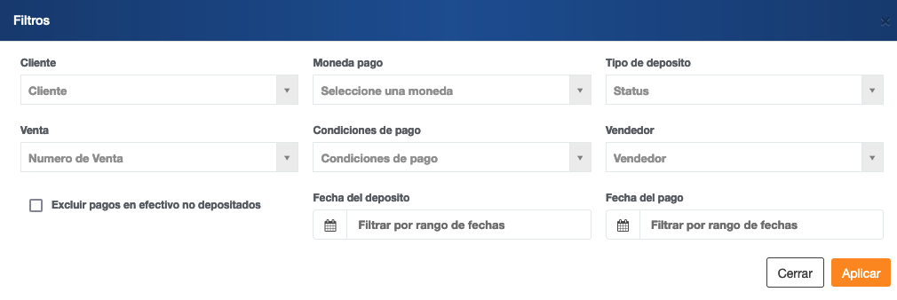 Se puede filtrar por Cliente, moneda pago, tipo de depósito, Venta, Fecha del depósito, fecha del pago y la casilla excluir pagos en efectivo no depositados. Puede exportar en PDF o bien Excel.