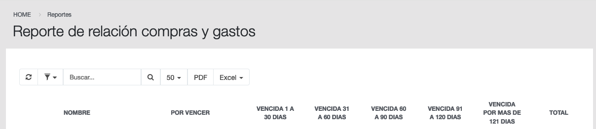 Ahora ya puede revisar la relación de compras y gastos por proveedor, puede filtrar por proveedor, divisa (moneda), sucursal, días de vencimiento.
